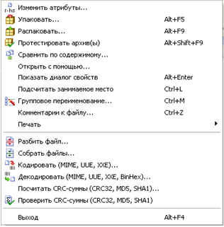 Изменить атрибуты файлаПозволяет устанавливать и сбрасывать атрибуты только для чтения (r), архивный (a), скрытый (h) и системный (s). Атрибуты NTFS сжатый (c) и зашифрованный (e) TC отображает в файловых панелях, но изменять не позволяет.УпаковатьПозволяет упаковать выбранные файлов одним из архиваторов: PKZIP, ARJ, LHA, RAR, UC2, ACE, TAR, GZ или TGZ. При подключении соответствующих плагинов доступны и другие архиваторы.РаспаковатьПозволяет распаковать все или только указанные файлы из архива под курсором или из открытого архива. |