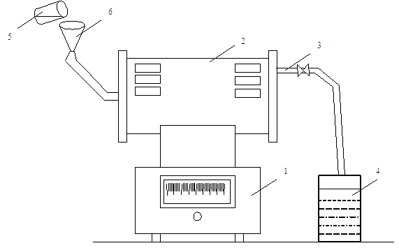 Рис.1. Установка для исследования теплообмена излучением. 1. Муфельная печь; 2. Металлическая печь; 3.Металлическая труба; 4. Мерный стакан; 5. Стакан; 6. Воронка.