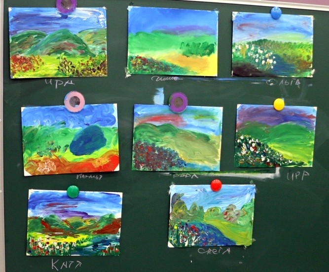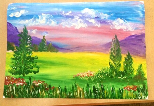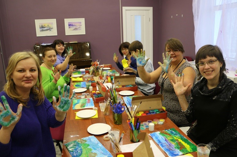 Наши занятия мы всегда начинаем с расслабляющей и настраивающей на работу дыхательной гимнастики - подготовка тела, знакомства участников - налаживание контакта, чувство безопасности. Далее приступаем к подготовке рабочего места, и вслед за педагогом по четкой схеме рисуем пейзаж от и до руками. В процессе участники открывают для себя новые возможности использования привычного материала, изучают цвета, способы смешивания цветов, пробуют различные техники нанесения краски на бумагу. В итоге получают готовый достойный пейзаж. А в завершении обязательна обратная связь, каждый рассказывая о том, что получил на занятии, снова возвращается в свое нормальное состояние, в « здесь и сейчас» - приводит к осознанию всего, что с ним произошло за последние два часа и принятию продукта своей деятельности, своей уникальности и одаренности.