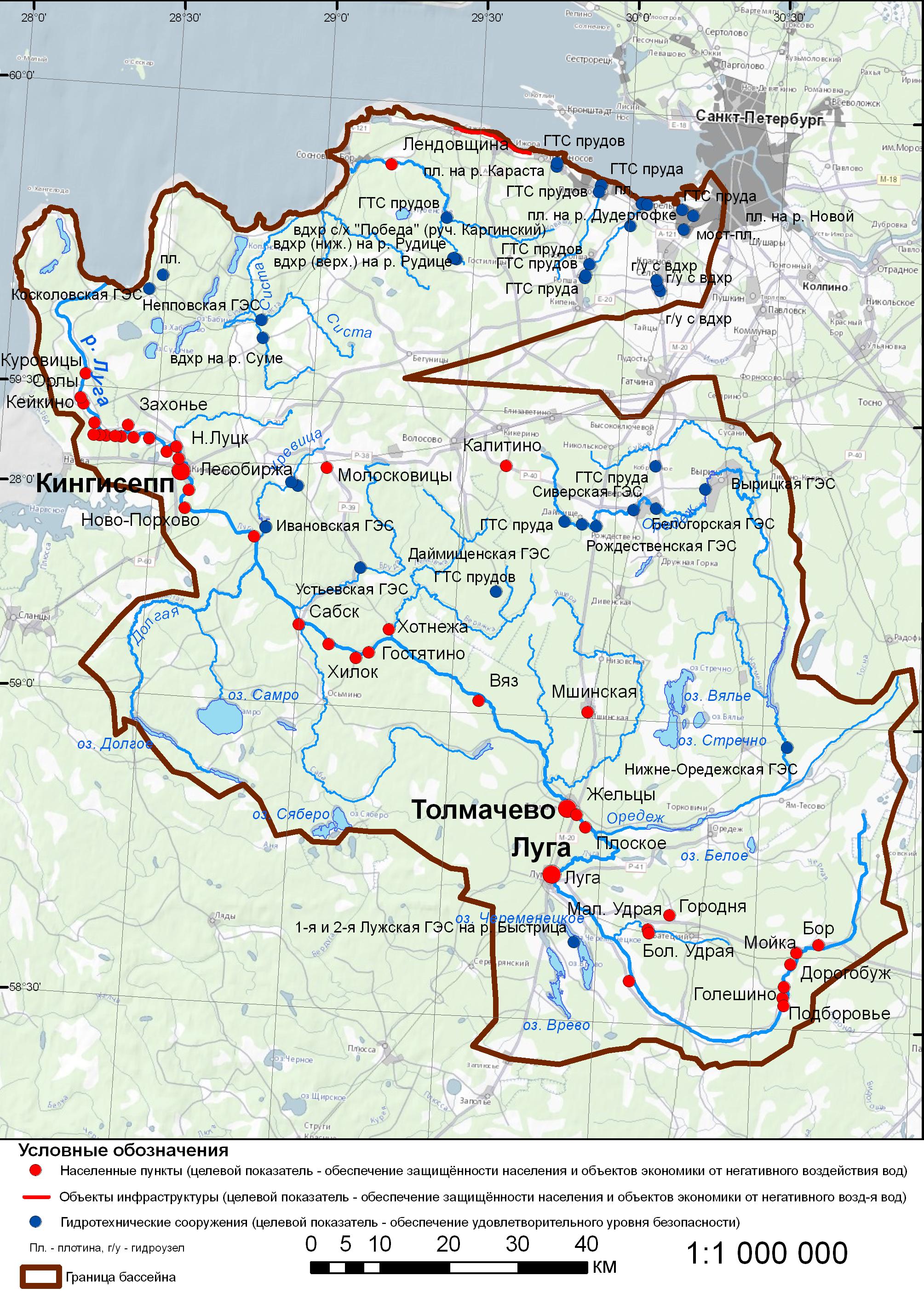 В Ленинградской области расположены 10 напорных ГТС в бассейне собственно Финского залива и 17 - в бассейне р. Луга. Большинство из них бесхозные. Наиболее крупными ГТС на территории Ленинградской области в пределах бассейна Луги являются плотины водохранилищ Лужского, Нижнеоредежского, Вырицкого и Рождественского. Ранее они предназначались для целей энергетики, в настоящее время используются для рекреации.