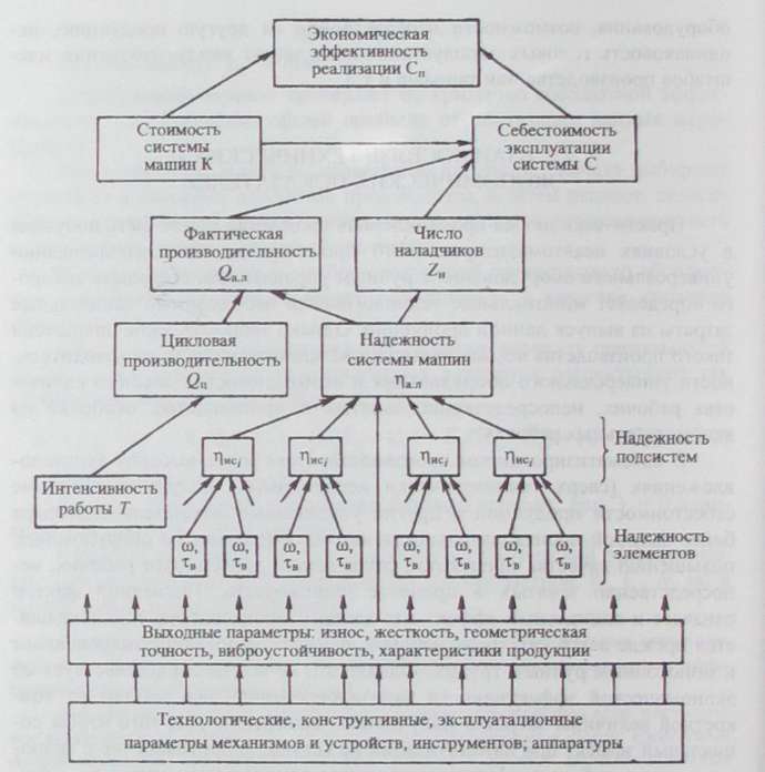 Качественно функциональные связи, действующие в масштабах автоматических систем машин, показаны на рисунке 3.2. Первичными факторами, от которых в конечном счете зависят все ТЭП, являются технологические, конструктивные, эксплуатационные параметры конструктивных элементов: механизмов, устройств, инструментов, аппаратуры, а также внешние воздействия на систему машин (характер энергии окружающей среды, заготовок и полуфабрикатов и т. д.).