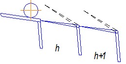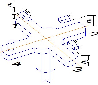 На транспортирующее устройство в виде звездочки, вращающейся вокруг вертикальной оси и имеющей 4 позиции, загружаются детали (от загрузочного устройства). Эти детали попадают на IV позицию. На трех других позициях, на разной высоте от плоскости стола, установлены упоры h1 > h2 > h3. Эти упоры сталкивают детали в прорези звездочки, если размер детали окажется больше высоты установки упора.