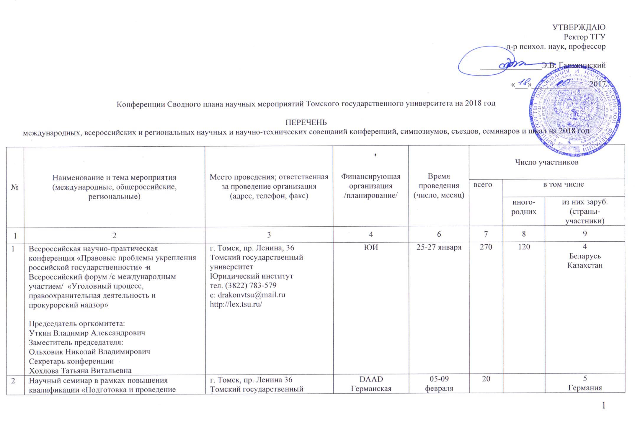 56 | Всероссийская научно-практическая конференция «Юридическая наука и образование в Сибири: традиции и инновации» Председатель оргкомитета: Заместитель председателя оргкомитета: Секретарь конференции: | г. Томск, пр. Ленина, 36 Юридический институт е: *****@***ru http://lex. tsu. ru/ | ЮИ | 25-26 октября | 170 | 80 | 4 Беларусь Казахстан |