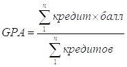 По результатам успеваемости рассчитывается средний балл GPA, максимальное выражение которого составляет 4,0 балла. GPA (Grade Point Average) – средневзвешенная оценка уровня учебных достижений студента. Средний балл студента рассчитывается по итогам результатов обучения в каждом семестре и по окончании обучения по формуле: