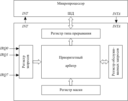 - восприятие и фиксация запросов прерываний от внешних устройств; определение незамаскированных запросов среди поступивших запросов; проведение арбитража: выделение наиболее приоритетного запроса из незамаскированных запросов в соответствии с установленным механизмом назначения приоритетов; сравнение приоритета выделенного запроса с приоритетом запроса, который в данный момент может обрабатываться в микропроцессоре, формирование сигнала запроса на вход INT микропроцессора в случае, если приоритет нового запроса выше; передача в микропроцессор по шине данных типа прерывания, выбранного в процессе арбитража, для запуска соответствующей программы - обработчика прерывания; это действие выполняется по сигналу разрешения прерывания INTA от микропроцессора, который выдается в случае, если прерывания в регистре флагов микропроцессора не замаскированы (IF=1).