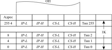 Переход к соответствующему обработчику прерывания осуществляется (в реальном режиме работы микропроцессора) посредством таблицы векторов прерываний. Эта таблица (рис. 5) располагается в самых младших адресах оперативной памяти, имеет объем 1 Кбайт и содержит значения сегментного регистра команд (CS) и указателя команд (IP) для 256 обработчиков прерываний.