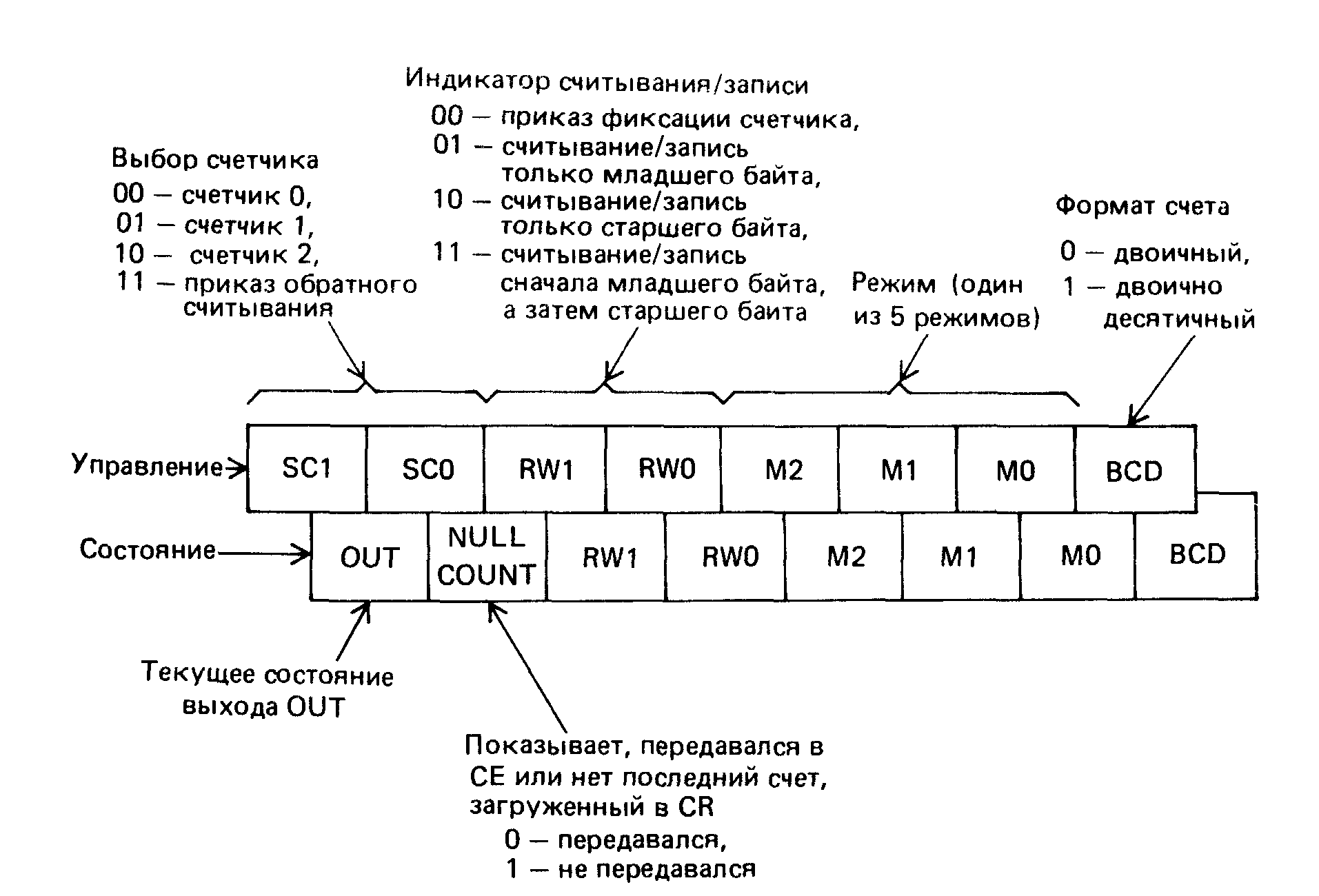 Форматы регистров управления и состояния показаны на рис. 9.27. Если два старших бита равны 1, они задают приказ обратного считывания; в противном случае они определяют счетчик. Если указан счетчик и биты 5-4 содержат нули, то имеет место приказ фиксации, который направляется в регистр управления выбираемого старшими битами счетчика. Когда же комбинация в битах 5-4 отличается от 00, она указывает тип ввода из OL или вывода в CR. Комбинация 01 идентифицирует операции считывания/записи из (в) OL^/CR, комбинация 10 - из (в) OLix/CRv» и комбинация 11 - выполнение операций парами (первый байт из (в) OLi /CRi и второй из (в) OLn/CR^i) Запись одного байта в CR вызывает сброс другого байта Биты 1, 2 и 3 определяют режим, а бит 0 определяет формат счета.