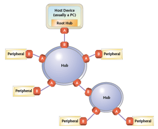 К корневому концентратору могут быть подключены либо устройства, либо еще концентраторы, для увеличения числа доступных портов. Допускается организация до пяти уровней. Концентратор может быть выполнен в виде отдельного устройства, либо быть встроенным в какое-то другое. С этой точки зрения устройства подключаемые к USB можно подразделить на функциональные устройства, т. е. те которые выполняют какую-то конкретную функцию и не берут на себя никаких дополнительных задач (например, мыши) устройства-концентраторы в чистом виде выполняющие только функцию разветвления, и совмещенные (комбинированные) устройства, т. е. имеющие в своем составе концентратор, расширяющие набор портов и позволяющие подключать другие устройства (в качестве наиболее часто встречающихся примеров можно назвать мониторы, позволяющие по USB осуществлять настройку параметров, и обычно имеющих еще несколько дополнительных портов, для подключения других устройств или клавиатуры, с разъемами для подключения мышей).