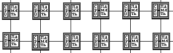 Такая архитектура с распределенной памятью часто упоминается как архитектура с параллелизмом данных(data-parallel), так как параллельность достигается при наличии одиночного потока команд, действующего одновременно на несколько частей данных. Сеть, соединяющая процессоры, обычно имеет регулярную топологию такую как кольцо SLAP: