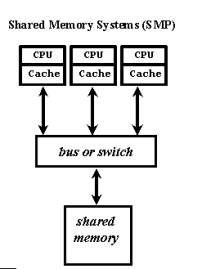 Характерной чертой многопроцессорных систем SMP архитектуры является то, что все процессоры имеют прямой и равноправный доступ к любой точке общей памяти. Первые SMP системы состояли из нескольких однородных процессоров и массива общей памяти, к которой процессоры подключались через общую системную шину. Однако очень скоро обнаружилось, что такая архитектура непригодна для создания сколь либо масштабных систем. Первая возникшая проблема - большое число конфликтов при обращении к общей шине. Остроту этой проблемы удалось частично снять разделением памяти на блоки, подключение к которым с помощью коммутаторов позволило распараллелить обращения от различных процессоров. Однако и в таком подходе неприемлемо большими казались накладные расходы для систем более чем с 32-мя процессорами.