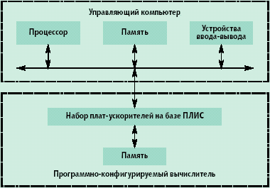 Такие вычислительные системы строятся из программируемых логических интегральных схем (ПЛИС), содержащих одну или несколько матриц вентилей и позволяющих программно скомпоновать из этих вентилей в одном корпусе электронную схему, эквивалентную схеме, включающей от нескольких десятков до тысяч интегральных схем стандартной логики [9].