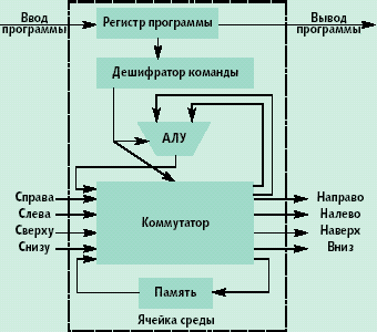 В разное время было предложено достаточно много проектов однородных вычислительных сред [1-5]. Какое-то схематичное представление о них дает Рисунок, на котором изображена структура ячейки гипотетической однородной среды. Ячейки находятся в узлах прямоугольной решетки и связаны двунаправленными информационными каналами. Кроме этого, ячейки связаны сетью для ввода программы в ячейку, задания режима ее функционирования «настройка/работа», тактирования. В режиме «настройка» каждая ячейка получает программу, возможно, состоящую из одной команды.