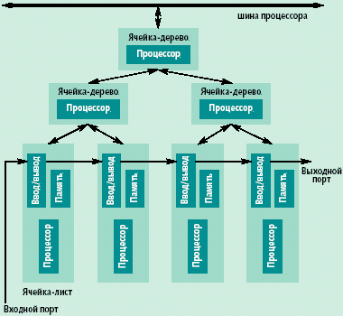 Ячейки, находящиеся на границе поля ячеек, имеют свободные каналы, к которым подключаются контроллеры памяти, периферийных внешних устройств. Прерывания от контроллеров передаются в виде специальных однословных сообщений, в которых указывается, какая ячейка должна обрабатывать это прерывание