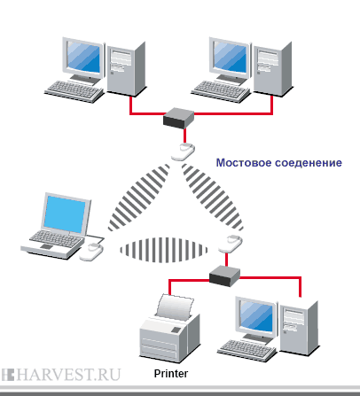Компьютеры объединены в проводную сеть. К каждой группе сетей подключены точки доступа, которые соединяются друг с другом по радио каналу. Этот режим предназначен для объединения двух и более проводных сетей. Подключение беспроводных клиентов к точке доступа, работающей в режиме моста невозможно.
