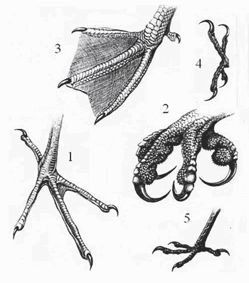По форме птичьей лапы можно судить об образе жизни ее обладателя. У хищников грозные крючковатые когти; у водоплавающих перепонки; у болотных птиц – длинные узкие пальцы; а у дятлов и попугаев одна пара пальцев обращена вперед, а другая – назад. У всех прочих птиц назад обращен один первый палец для удобства ходьбы и сидения на ветке.