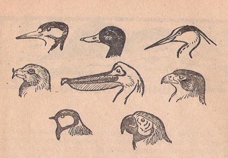 (дятел, утка, цапля, клест, пеликан, сокол, синица, попугай)