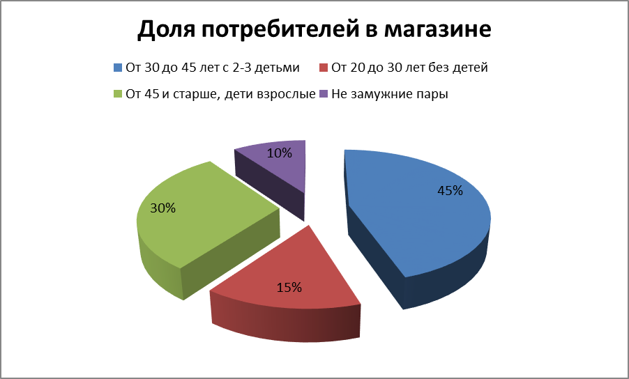 Чтобы убедиться, сколько процентов занимает каждый вид семьи, которые посещают данный магазин, достаточно взглянуть на круговую диаграмму 2.1.