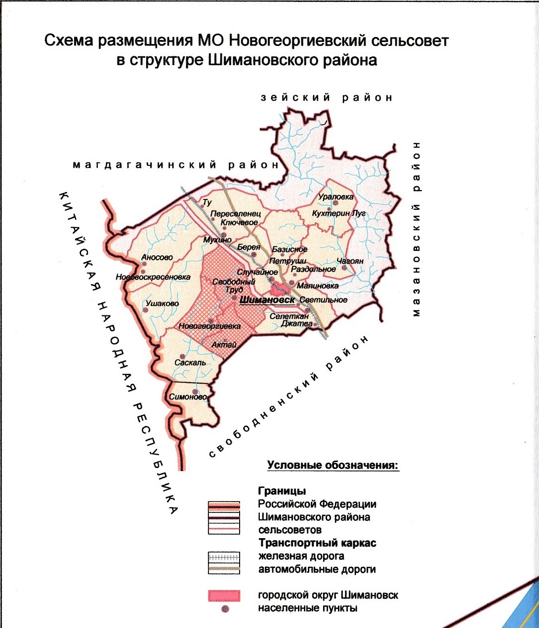 Муниципальное образование Новогеоргиевский сельсовет входит в состав Шимановского муниципального района и является одним из 12 аналогичных административно-территориальных муниципальных образований (поселений) района. Новогеоргиевский сельсовет расположен в юго-западной части Шимановского района. С севера и с северо-востока граничит с Мухинским, Береинским, Петрушинским сельсоветами, с северо-запада граничит с Ушаковским сельсоветом, с юго-запада с Саскалинским сельсоветом, с юго-востока и востока территори поселения граничит с территориями Свободнеского района, Селетканского сельсовета. Площадь муниципального образования составляет 1805,05 кв. км. В состав Новогеоргиевского сельсовета входят 3 населенных пункта: с. Новогеогиевка, с. Актай и С. Свободный Труд, в которых проживает 755 человек. Численность населения в разрезе населенных пунктов приведена в таблице 1.