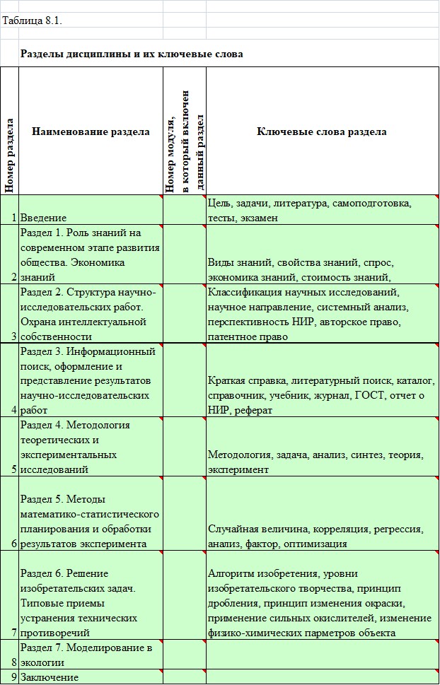 Таблица 8.1 – Ключевые слова разделов дисциплины