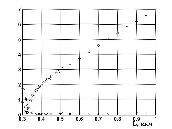 Рис.1. Значения действительной (х) и мнимой (о) части комплексного показателя преломления включения серебра в зависимости от длины волны (L) падающего излучения. Согласно табличным данным из [1]. |