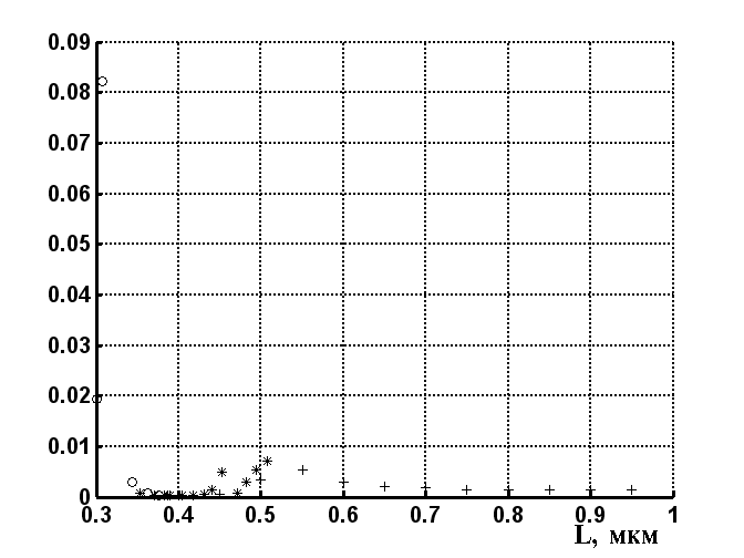 Рис.2. Зависимость коэффициента эффективности поглощения для включений серебра в матрице азида серебра при различных длинах волн падающего излучения (L). Символами “o”,“*”,“+” обозначены различные серии исходных данных. |
