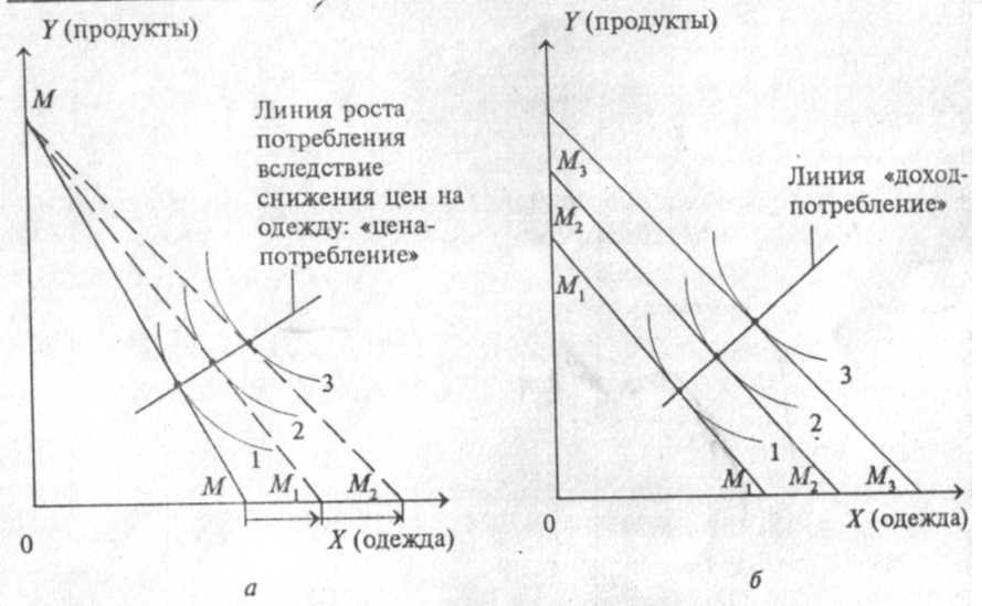 Цена блага определяется не общей, а предельной его полезностью для потребителя. Поскольку предельная полезность блага по мере потребления его дополнительных единиц снижается, то потребитель будет увеличивать объем покупок (объем спроса) лишь при снижении цены. Этим объясняется убывающий характер кривой спроса. Максимум удовлетворения от потребления заданного набора благ потребитель получит при условии равенства предельных полезностей всех потребленных благ. Этот принцип впервые был сформулирован Г. Госсеном и вошел в науку как второй закон Госсена. Для конкретного потребителя функция полезности максимизируется в том случае, когда его денежный доход распределяется таким образом, что каждый рубль, затраченный на приобретение любого блага, приносит одинаковую предельную полезность. Для моделирования потребительского поведения, т. е. спроса отдельного потребителя, используются такие инструменты, как кривые безразличия и бюджетное ограничение. Кривая безразличия — это множество точек, представляющих равноценные для потребителя наборы из двух товаров (потребителю безразлично, какой из этих наборов выбрать) — они имеют одинаковую полезность. Кривая безразличия обычно выпукла к началу координат. Набор кривых безразличия, в котором каждая последующая кривая располагается выше и правее предыдущей, называется картой безразличия. Более удаленные от начала координат кривые безразличия соответствуют более высоким уровням полезности. Кривые безразличия не могут пересекаться, так как если это произойдет, то будет нарушена аксиома транзитивности предпочтений. Они могут касаться осей координат, однако обычно их изображают так, что этого не происходит. Для изображения множества доступных потребителю товарных наборов используется бюджетная линия (линия цен или линия расходов). Смысл бюджетного ограничения состоит в том, что доход потребителя равен сумме расходов на покупку товаров х и у.14. Оптимум потребителя (максимум благосостояния при данном ограничении) достигается в точке касания бюджетной линии кривой безразличия.