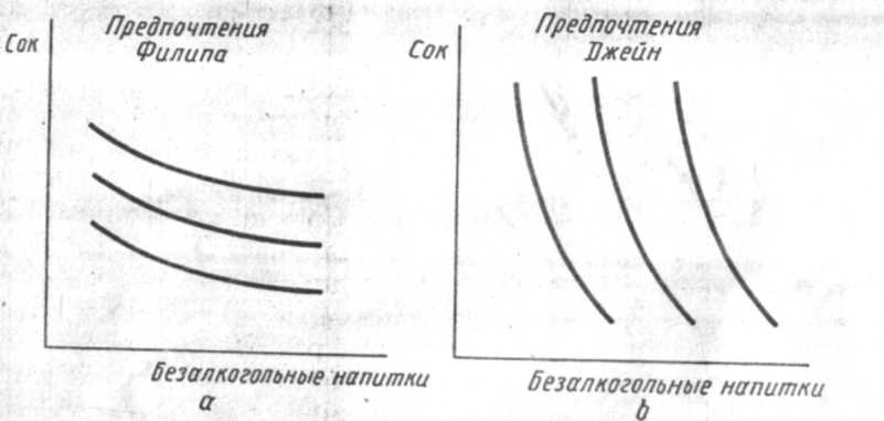 Формы кривых безразличия могут указывать на различные степени желательности замены одного товара другим. Рассмотрим, например, предпочтения Филиппа и Джейн в потреблении сока и безалкогольных напитков на рис. 2.3. На рис. 2.3а кривые безразличия Филиппа показывают относительно низкую (и убывающую) предельную норму замещения безалкогольных напитков соком. Он готов отказаться от очень небольшого количества сока ради других безалкогольных напитков. Очевидно, что Филипп оказывает сильное предпочтение соку, на которое особенно не влияет его потребление безалкогольных напитков. На рис. 2.3b показаны предпочтения Джейн. У нее высокая предельная норма замещения безалкогольных напитков соком. Ее предпочтение безалкогольным напиткам сильнее. Если бы Джейн совсем не любила сок, ее кривые безразличия представляли бы прямые вертикальные линии. Аналогичным образом если бы Филипп был равнодушен к безалкогольным напиткам, то кривые безразличия у него были бы прямыми горизонтальными линиями.