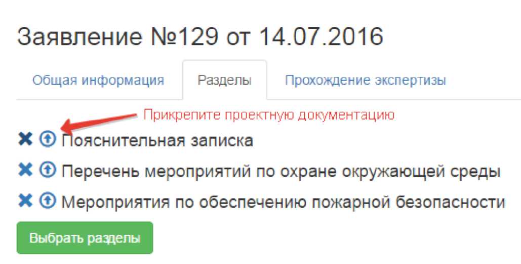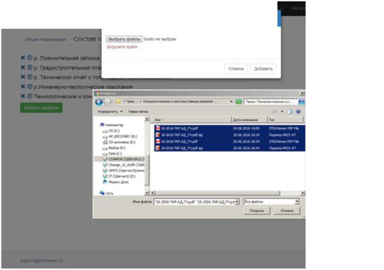 Прикрепляете проектную документацию, выбрав в папке на вашем компьютере одновременно все файлы, относящиеся к разделу. Допускается удаление и добавление файлов на этапе подачи заявления.