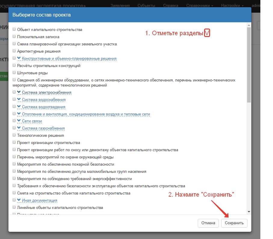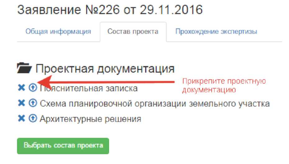 На втором этапе вы прикрепляете проектную документацию, результаты инженерных изысканий и сметную документацию во вкладке «Состав проекта».Все необходимые разделы отмечены галочкой ![]()