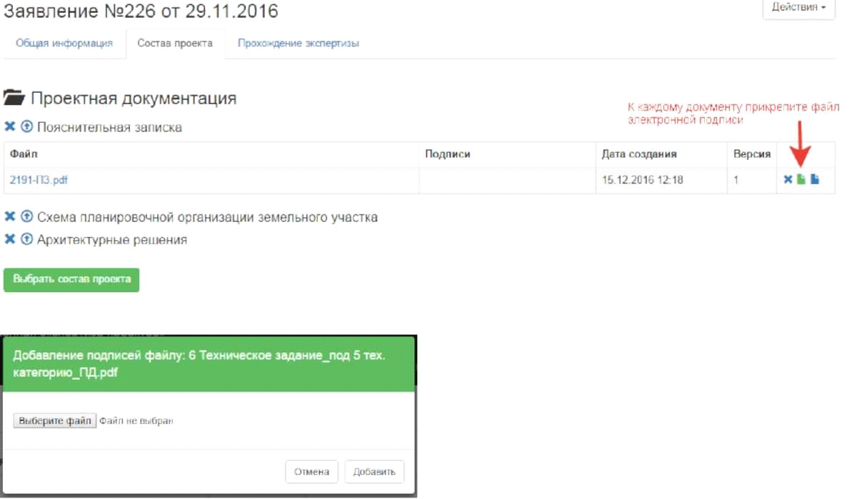Подпишите документ ЭП с помощью КриптоАРМ в соответствии с указаниями (п.3.2. данных указаний) Прикрепите заявление и файл подписи во вкладке «Исходно-разрешительная документация» Направьте заявление в АУ АО «Государственная экспертиза проектов» на рассмотрение.