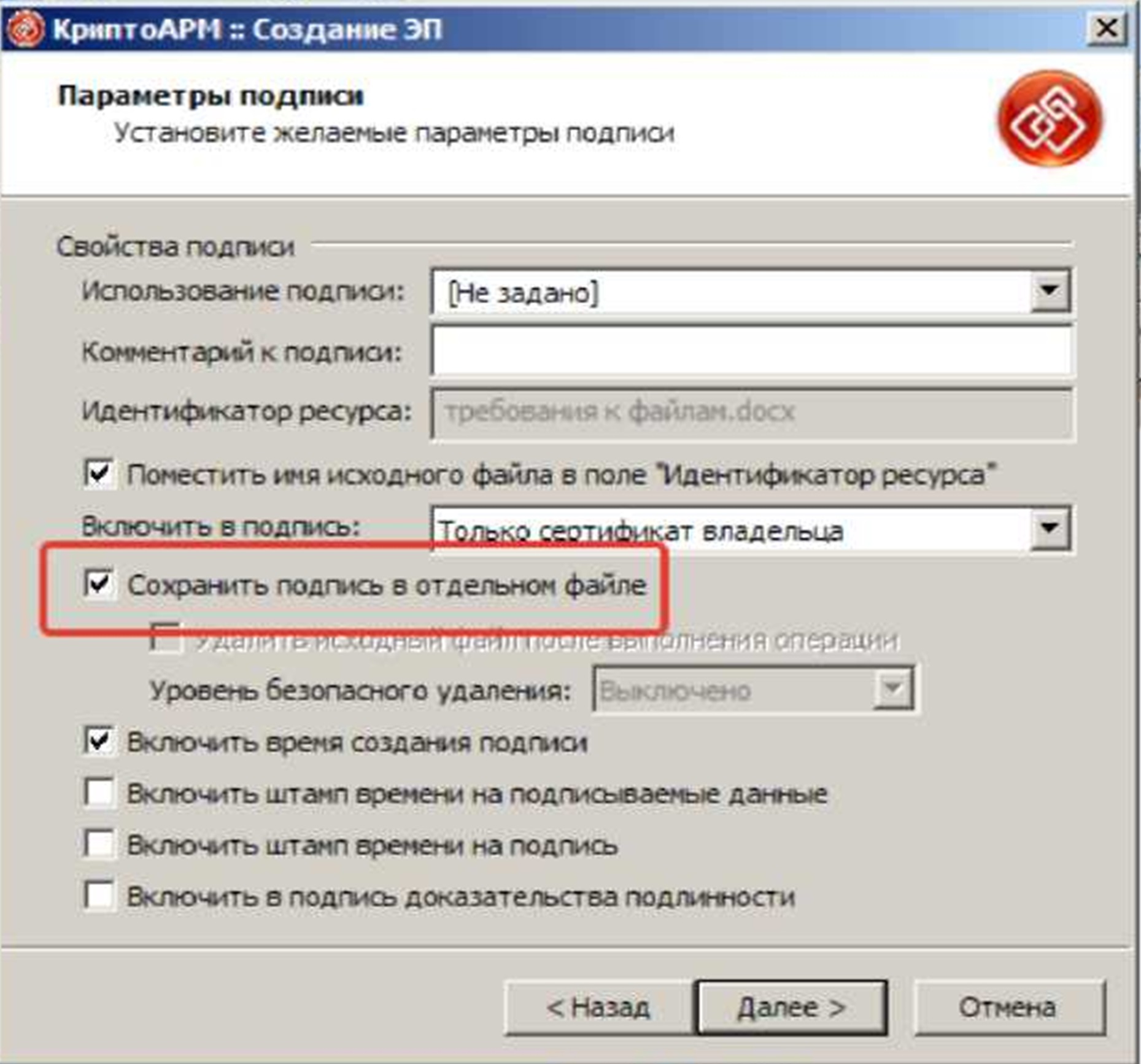 Обратите внимание! Для направления документов на экспертизу необходимо при подписании выбирать «Сохранение подписи в отдельном файле»