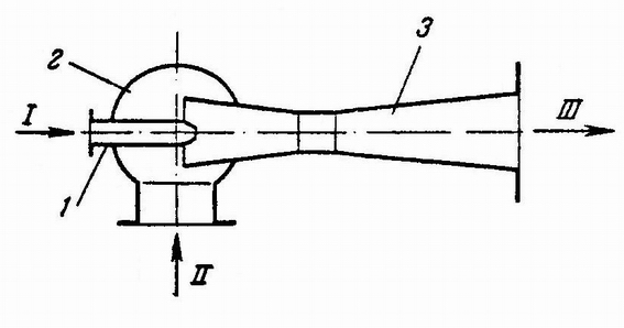 Рабочая жидкость I поступает с большой скоростью из сопла 1 через камеру смешения 2 в диффузор 3, увлекая за счет поверхностного трения перекачиваемую жидкость II. В наиболее узкой части диффузора скорость смеси рабочей и перекачиваемой жидкостей достигает наибольшего значения, а статическое давление потока в соответствии с уравнением Бернулли, становится наименьшим. Перепад давлений в камере смешения и диффузоре обеспечивает подачу жидкости II в камеру смешения из всасывающей линии. В диффузоре скорость потока уменьшается, но увеличивается потенциальная энергия давления, и жидкость под напором поступает в нагнетательный трубопровод.