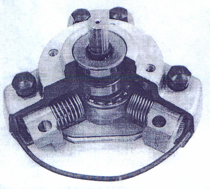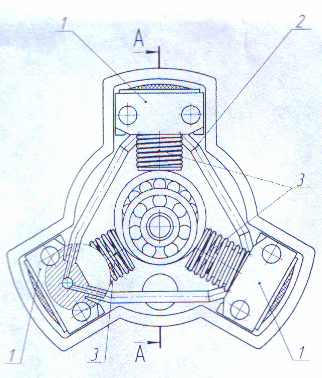 На эксцентриковой части вала 14 установлен подшипник 12, на который опираются поршни 6, установленные в цилиндрах 1. Пружины 3 установлены между цилиндром 1 и опорными головками поршня 3 и прижимают постоянно поршень к подшипнику 12 эксцентрика вала.