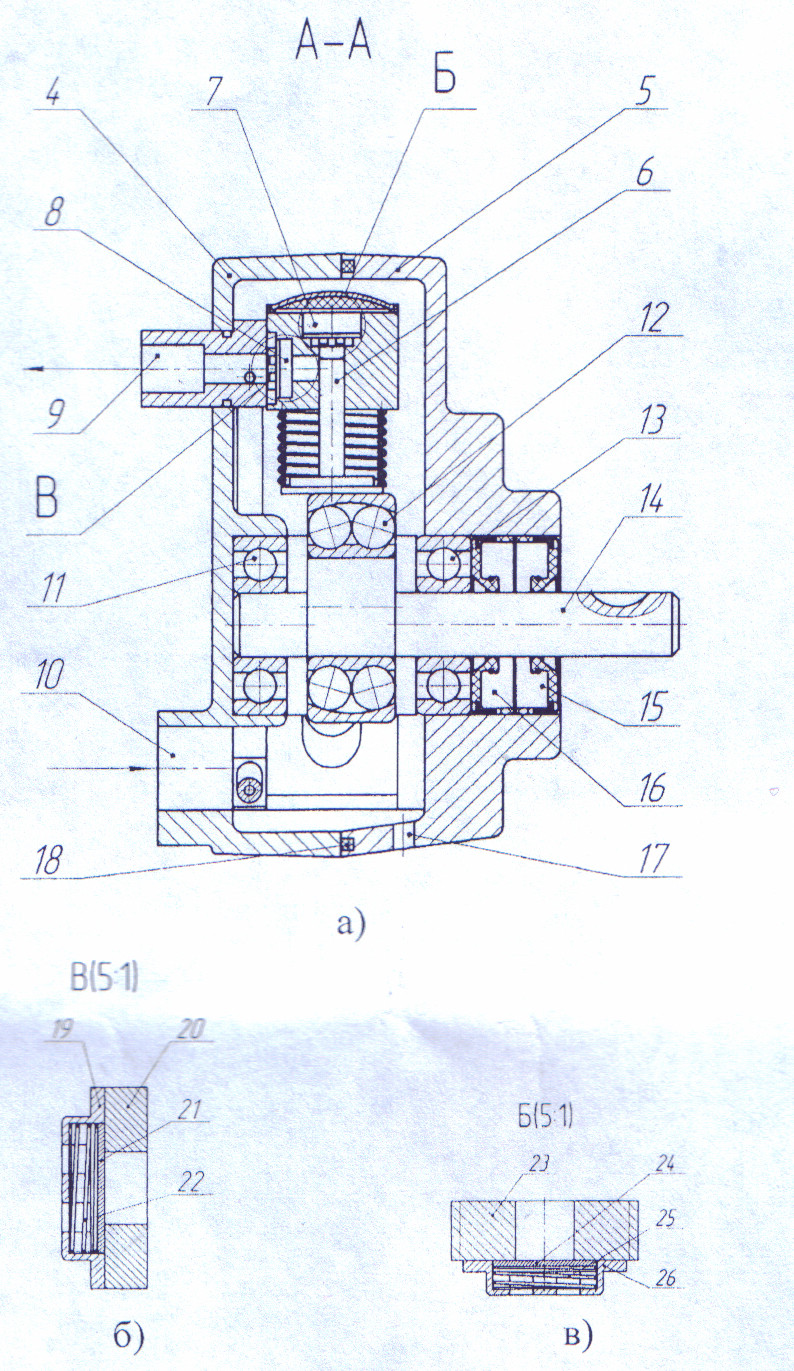 В переднем распределительном диске 3 предусмотрены пазы (рисунок 7 г) для всасывания и нагнетания рабочей жидкости, а так же пазы для соединения к центру ротора торцовых поверхностей пластин с напорной (на участке нагнетания) или всасывающей (на участке всасывания) линиями. Задний опорный диск имеет связанною с напорной линией кольцевую проточку, обеспечивающую поджим диска к ротору и статору.