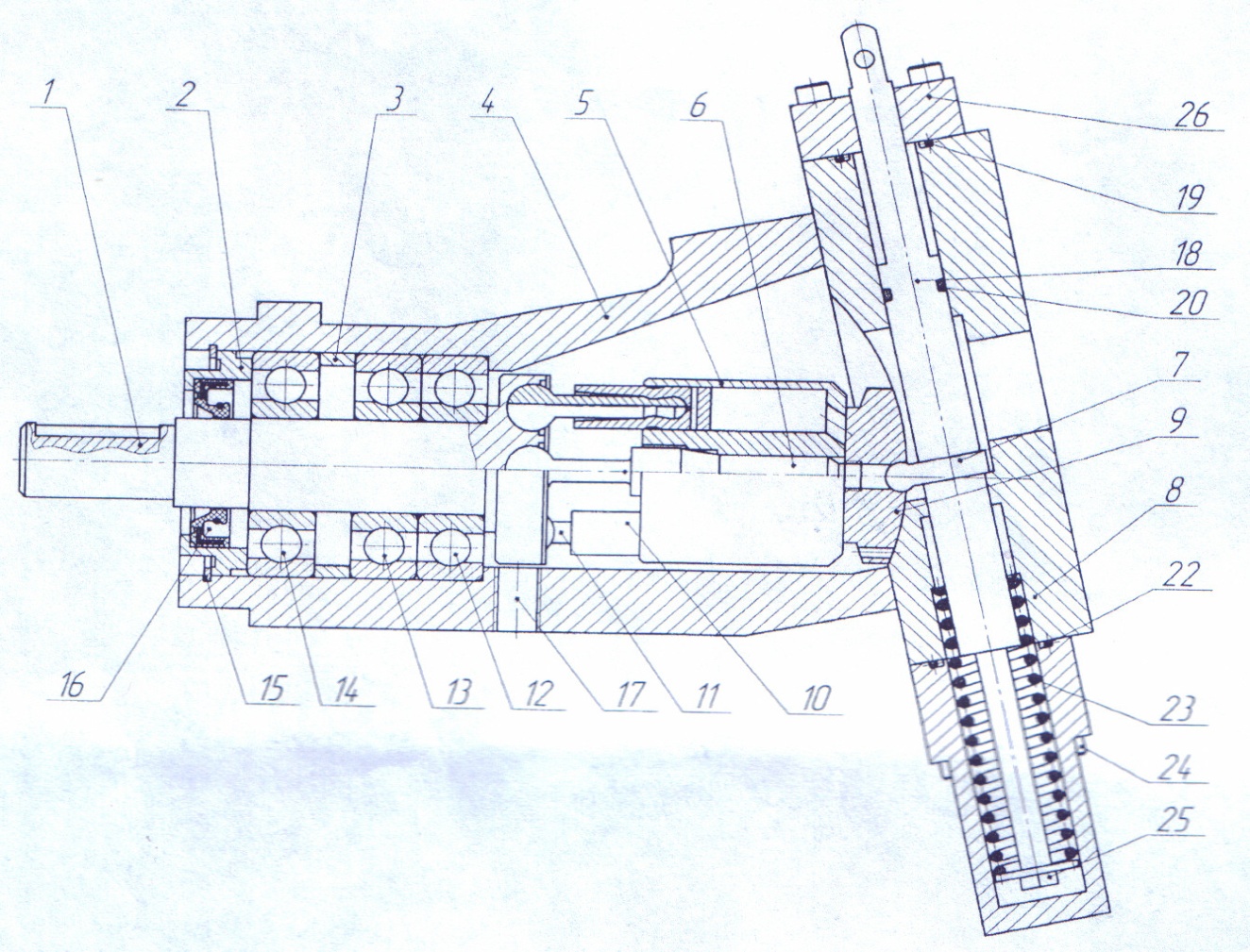 1 - вал; 2 - крышка крепления подшипников и уплотнения; 3 - дистанционная втулка; 4 - корпус регулятора; 9 - сферический опорно-распределительный диск; 10 - поршень; 11 - шатун; 12,13,14 - подшипники; 15-стопорное кольцо; 16-уплотнительная манжета вала; 17- пробка дренажного отверстия; 18 - тяга ручного изменения рабочего объема насоса; 19,20,22 - уплотнение; 23 - пружина; 24 - болты; 25 - винты предварительного натяжения пружины регулятора; 26 - крышка регулятора.