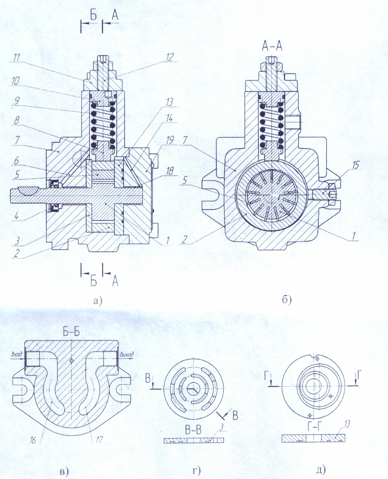 1-ротор;2-статор;3- передний распределительный диск; 4-уплотнительная манжета вала; 5- пластина;6,14-разгрузочный канал; 7- корпус насоса;8-толкатель;9-пружина; 10-поршень; 11- крышка регулятора; 12- регулировочный винт; 13-задний опорный диск; 15 - пробка дренажного канала; 16,17- каналы всасывания и нагнетания; 18- подшипник скольжения; 19-крышка. .
