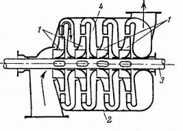 Напор одноступенчатых центробежных насосов (с одним рабочим колесом) ограничен и не превышает 50 м. Для создания более высоких напоров применяют многоступенчатые насосы (рис.2), имеющие несколько рабочих колес 1 в общем корпусе 2, расположенных последовательно на одном валу 3. Жидкость, выходящая из первого колеса, поступает по специальному отводному каналу 4 в корпусе насоса во второе колесо (где ей сообщается дополнительная энергия), из второго колеса через отводной канал в третье колесо и т. д.
