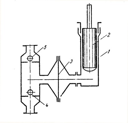 Подъемник (рис. 12) состоит из трубы 1 для подачи сжатого воздуха и смесителя 2, где образуется газо-жидкостная смесь, которая вследствие меньшего удельного веса поднимается по трубе 3. На выходе из нее газо-жидкостная смесь огибает отбойник 4. При этом из смеси выделяется воздух, а жидкость поступает в сборник 5.