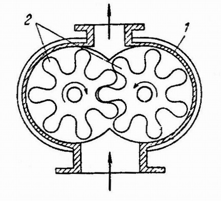В корпусе 1 такого насоса заключены две шестерни 2, одна из которых (ведущая) приводится во вращение от электродвигателя. Когда зубья шестерен выходят из зацепления, образуется разряжение, под действием которого происходит всасывание жидкости. Она поступает в корпус, захватывается зубьями шестерен и перемещается вдоль стенок корпуса в направлении вращения. В области, где зубья вновь входят в зацепление, жидкость вытесняется и поступает в напорный трубопровод.