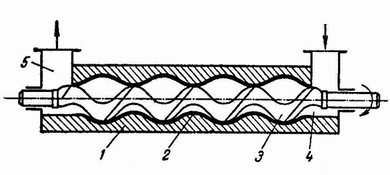 В корпусе 1 насоса, в котором заключен цилиндр 2 с внутренней профилированной винтовой поверхностью, называемый обоймой, устанавливается однозаходный винт 3. Между обоймой и винтом образуются замкнутые полости, заполняемые при работе насоса жидкостью; при работе винта они перемещаются вдоль оси насоса.