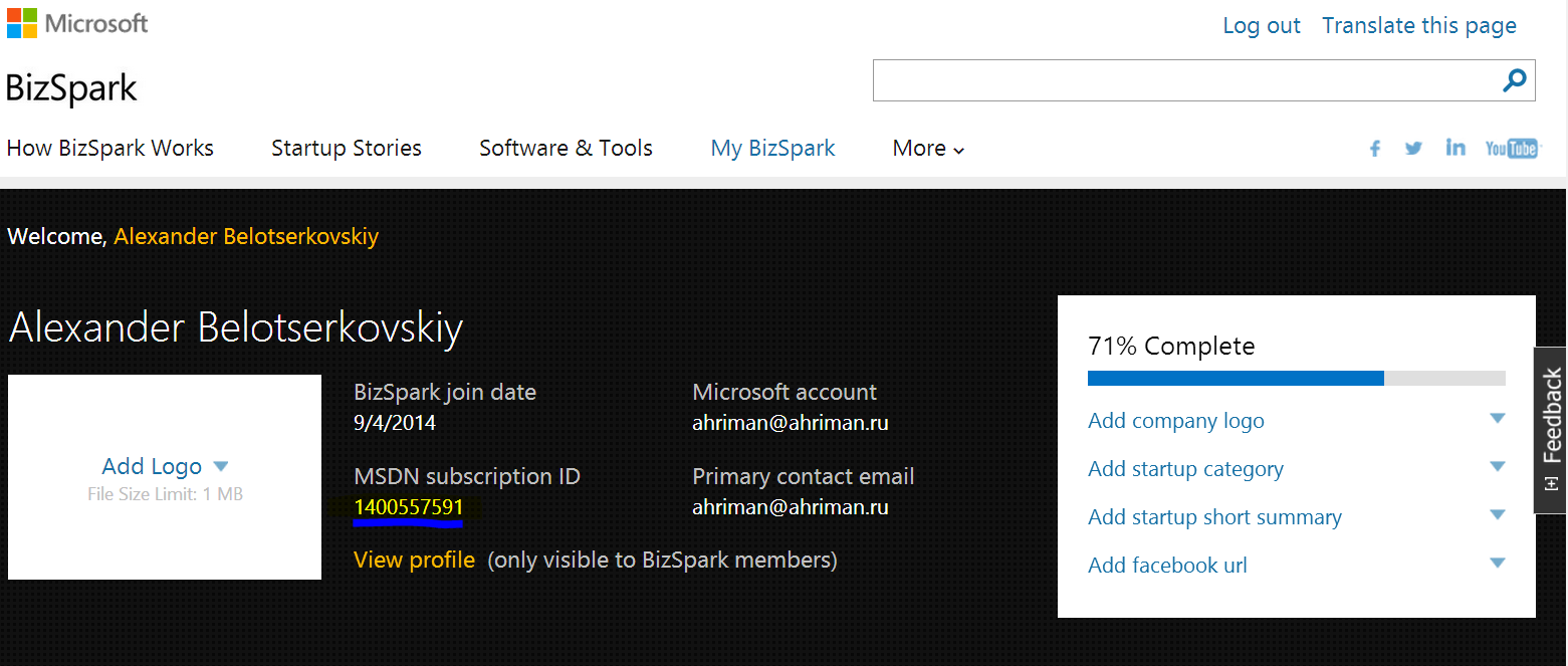 Перейдите на официальный сайт BizSpark: https://www. /bizspark/startup. Запомните идентификатор подписки (на скриншоте выделен желтым).