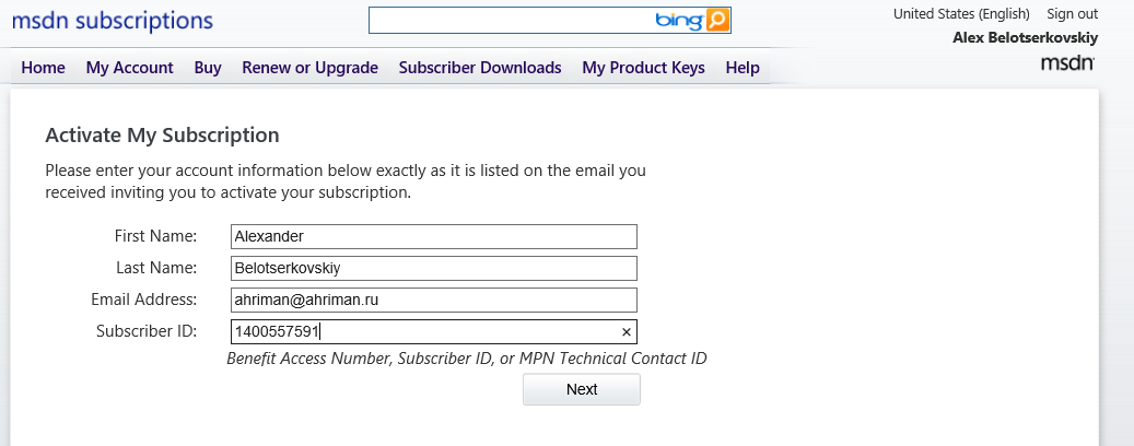 Нажмите на ссылку Add an existing subscription (ссылка https://msdn. /en-us/subscriptions/add/). Это обязательное действие.