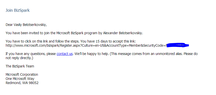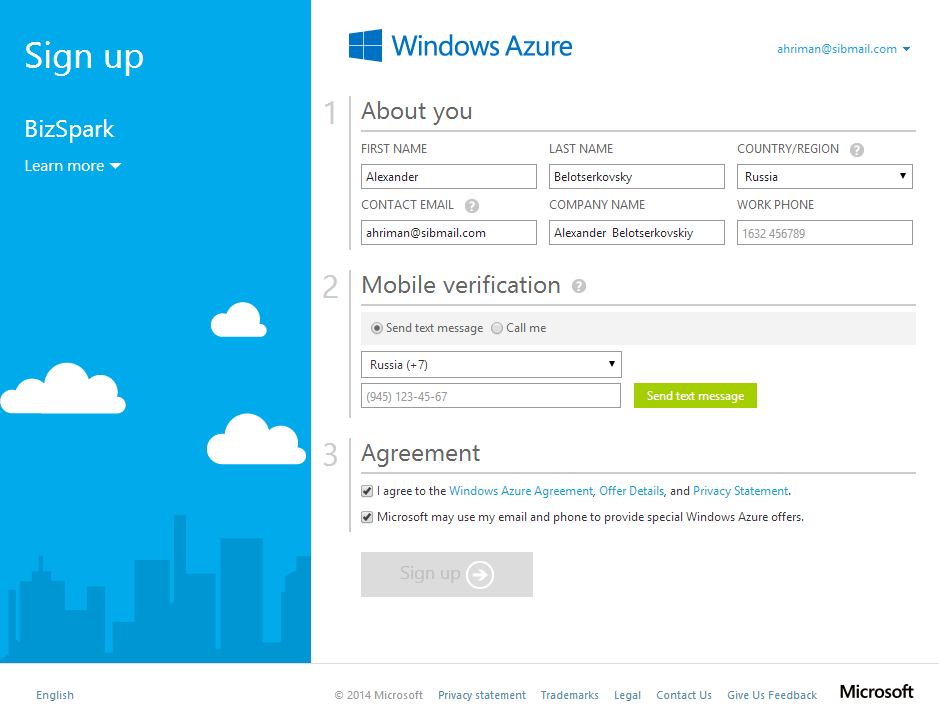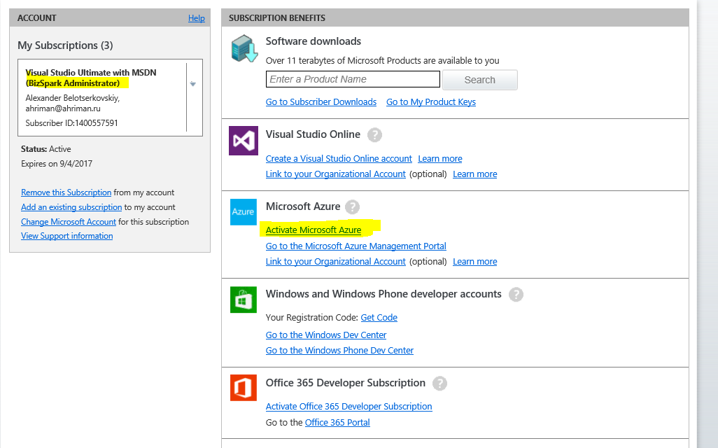 Активация Microsoft Azure в BizSpark
