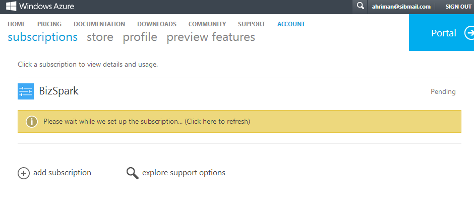 Bizspark приступит к созданию подписки. Это может занять некоторое время.