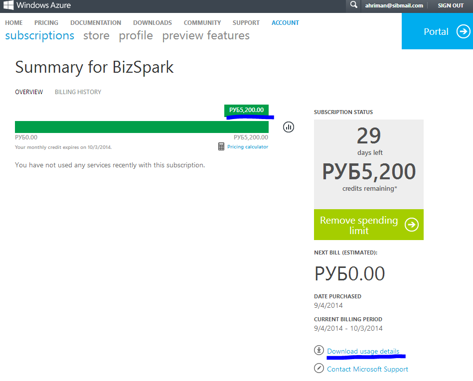 После создания вы будете переведены в ваш личный кабинет подписки Microsoft Azure. Здесь можно посмотреть историю потребления сервисов, сколько денег осталось, получить подробный отчет по использованию (Download usage details). Вы можете начинать использовать Microsoft Azure, перейдя на один из порталов – http://manage. либо новую версию по адресу http://portal. .