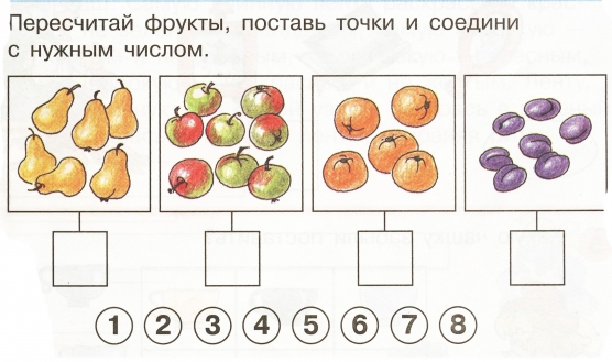 - Задание висит на доске. Нужно посчитать фрукты, поставить нужное количество точек и провести линию (смотреть приложение).