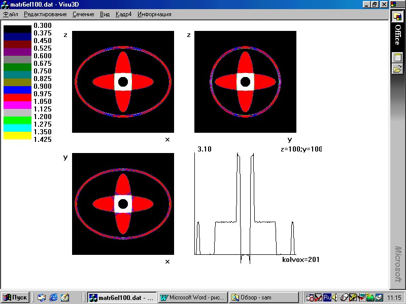 В ИПРИ НАН Украины коллективом oтдела специализированных средств моделирования ведутся работы в данном направлении. В 2001 году в oтделе были разработаны алгоритмы объемной реконструкции объектов в конических пучках. В разработке этих алгоритмов мы опирались на метод Фельдкампа для круговой траектории сканирующей системы, так как анализ и сопоставление имеющихся алгоритмов показал, что алгоритм Фельдкампа, относящийся к классу приближенных, имеет ряд существенных особенностей, сделавших его привлекательным для многих разработок [6]. На основе полученных алгоритмов был разработан и реализован комплекс программного обеспечения, представляющий собой интегрированную многофункциональную диалоговую систему [7]. Весь комплекс ориентирован на моделирование объемных реконструкционных алгоритмов. Для исследования алгоритмов реконструкции больших объектов при их половинном охвате системой «источник излучения – матрица детекторов» комплекс программ был доработан.