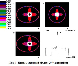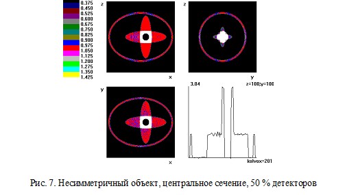 Рис. 7. Несимметричный объект, центральное сечение, 50 % детекторов