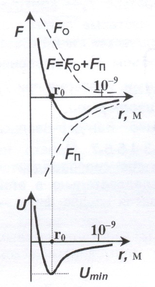 - это равновесное расстояние между молекулами, на котором бы они находились в отсутствие теплового движения. Потенциальная энергия взаимодействия молекул U минимальна в состоянии устойчивого равновесия при