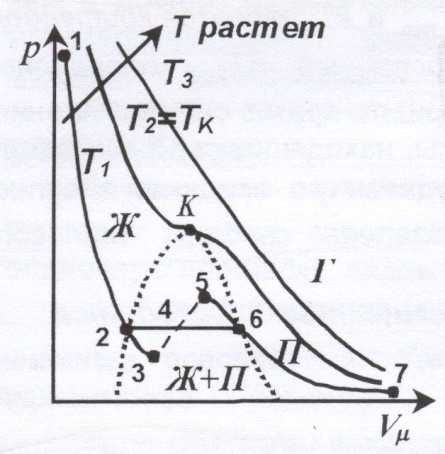 Вещество в газообразном состоянии при температуре ниже критической называется паром (П), а пар, находящийся в равновесии со своей жидкостью, называется насыщенным (Ж + П). Пар при изотермическом сжатии претерпевает процесс сжижения. Газ, при температурах
